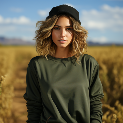 a women in fall themed field wearing a completely blank dark green Gildan brand crewneck sweater --s 750