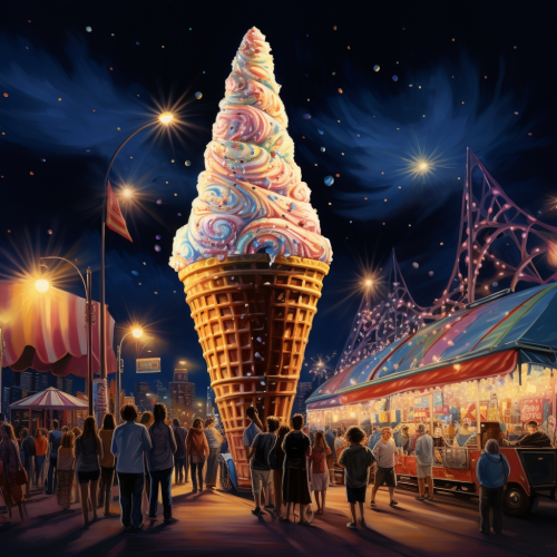 a huge ice cream cone at a carnival at night with a ferris wheel in the background, only a few people who are excited to see the ice cream are in the scene.