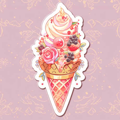 Design an enchanting sticker featuring a kawaii (cute) strawberry ice cream in a cone. The sticker showcases a delectable strawberry, chocolate-flavored ice cream, perfectly swirled in an intricate and ornate cone. The ice cream cone is adorned with delicate designs and patterns, have cute bear and bee. The strawberry chocolate ice cream is richly colored, with a vibrant shade of pink that looks tantalizingly delicious. A charming smile graces the face of the ice cream, and its eyes sparkle with delight. This kawaii sticker captures the whimsy and elegance of a sweet strawberry treat, inviting joy and indulgence. –style raw --niji 5
