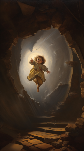 Alice falling down the rabbit hole, melting planets in the background, surreal, trippy, colorful, high contrast --ar 16:9