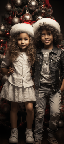 Eccentric and quirky children are dancing awkwardly around the Christmas tree. They are meticulously posed and positioned in a minimalist symmetrical setting. Black and white with vibrant color splash. Vibrant hues. Tapestry of whimsy. nostalgia with a dash of quirky charm. Shot with a Pentax. K - 3 III Monochrome. Santa hats. Christmas tree in background. Presented in vaporwave art style. Extreme close - up camera angle. Very close. Low angle camera shot. Looking straight up, Blurred background. Bakeh elements. High - end. Very Stylish. Black and white photograph. --ar 4:9 --q 0.5 --s 750