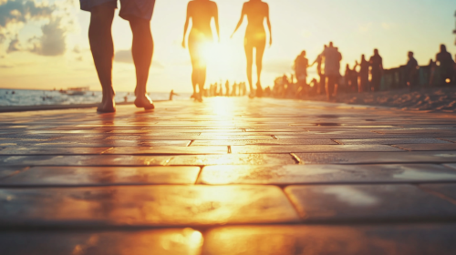 a cinematic low angle shot of a beach side pier walk on a scorching hot sunny summer's day, you can see people in the foreground and background enjoying themselves ultra realistic photo realistic cinematic glow --ar 16:9 --style raw