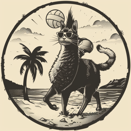 simple logo of a cat riding a llama with a Mohawk and pit viper sunglasses on the beach with a volleyball, monochromatic