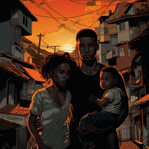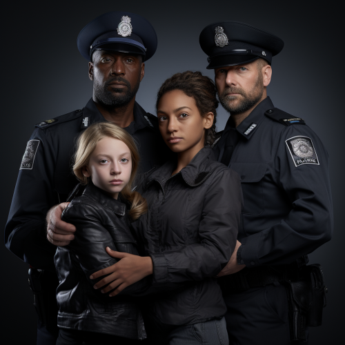 ultra-realistic image of a family composed of a black father, a white mother, a black daughter and a white son. the father similar to Giambruno, the mother to Giorgia Meloni and the son to Matteo Salvini. Dressed as policemen. in the foreground and with a 16:9 aspect ratio