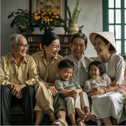 Photo of a modern Vietnamese family, with 6 people, including father, mother, grandfather, grandmother, son, daughter, gathered together happily, laughing and talking --v 6.0