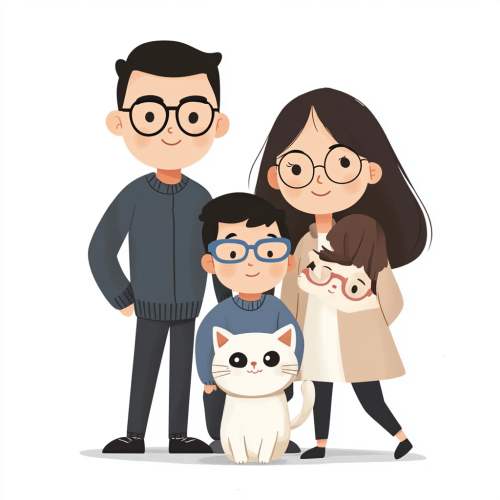 A family of four in China includes a young father and mother, a 10-year-old older brother, and a 7-year-old younger sister. The father wears black-framed glasses, and the mother has long hair and also wears glasses. They also have an adorable white cat with long white fur and blue glasses. In the family portrait, the father, mother, older brother, younger sister, and the cat are all present, standing together for the photo.