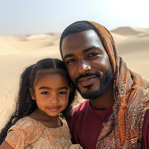 photo of African American man with Arab wife and daughter in the desert of Dubai during the sunset. The African American man is wearing glasses, and new school red baggy t shirt, and a white scarf covering his head, took from iPhone 16 --ar 3:4 --s 750 --q 2
