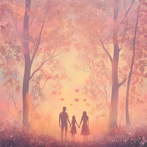 A soft, pastel-colored forest at sunset, representing family love. The trees have delicate, glowing pastel leaves in shades of pink, peach, and light gold, casting a gentle light over the serene landscape. In the center, a family holds hands, their silhouettes subtly blending into the pastel hues of the forest, creating a seamless connection between nature and emotions. Surreal elements like softly floating heart-shaped leaves and gentle glowing orbs drift around them, symbolizing love and unity. The overall atmosphere is calm, with soft pastel tones of lavender, pale pink, and light peach filling the scene in a dreamy, peaceful glow, with no harsh contrasts or dark shadows.