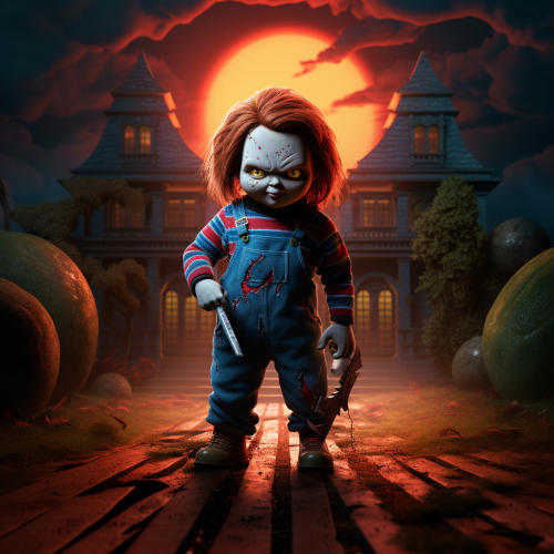 a picture of chucky from the movie child's play carrying a red knife in the theme of halloween, super detail in face and clothes, chucky standing at the front door of an old creepy house , wide open space leading up to a monothilic building in the distance, autumn colored leaves swirling in the area, bright full moon giving off lots of background light, nighttime, photorealism, super scary, ultra realistic, 16:9,
