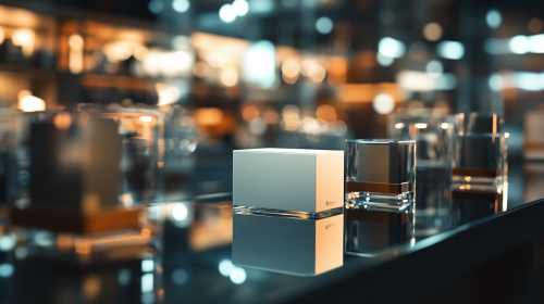 luxury packaging made of methacrylate displayed in a luxury store shot on 35mm film, Roger Deaken style, using fast anamorphic lenses with shallow depth of field, gritty looking, with film grain --ar 16:9
