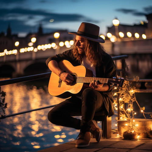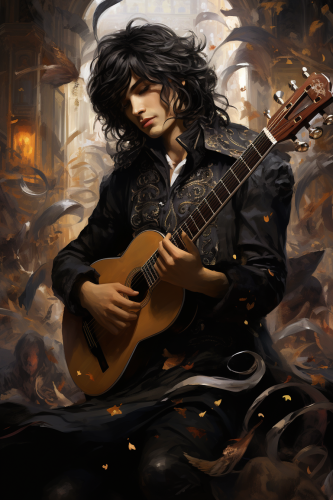 15 year old boy with black wavy hair dressed in bard clothes dnd, good looking, musical notes audible, playing a gituarr, highly detailed, --ar 2:3 --s 250
