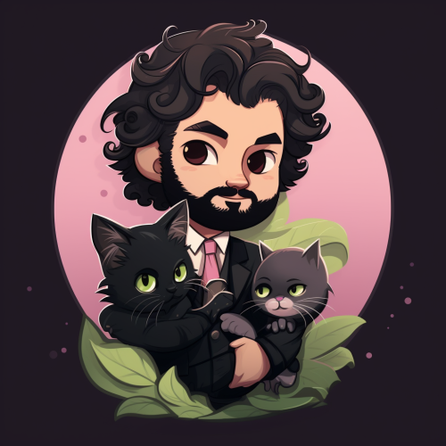 Young dark long curly hair musician with beard. Tuxedo jacket with stuffed little cat as a pocket square. Cute illustration style. --v 5.2