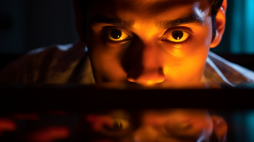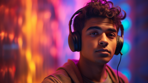 ultra close up of indian-american young man, musician, focused, vibrant colorful cinematic lighting --ar 16:9