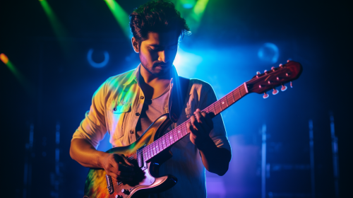 close up photograph of indian-american young man, guitar, musician, focused, vibrant colorful cinematic lighting --ar 16:9