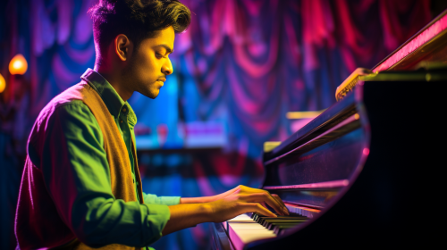 close up photograph of indian-american young man, piano, musician, focused, vibrant colorful cinematic lighting --ar 16:9
