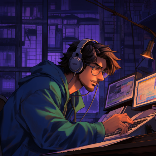 a 20 year old male with a short beard and mustache, medium length brown hair and glasses, making a beat in a chill studio, cowboy bebop style