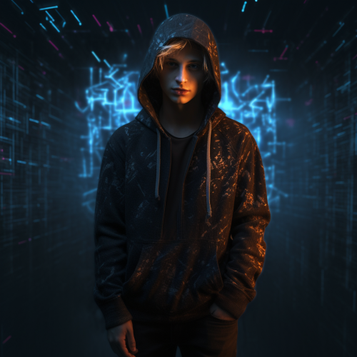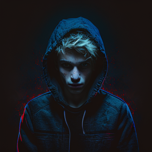 full body, young male, dirt in his face, blonde died hair, big blue eyes, innocent look, slanky, black hoodie, 8k, digital art, octance render, extreme detail, simple and minimalistic background, abstract music notes in the background, dark blue and red lights, cinematic lighting --v 5.0