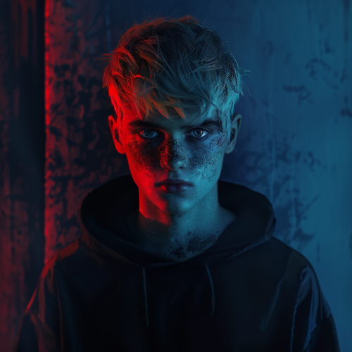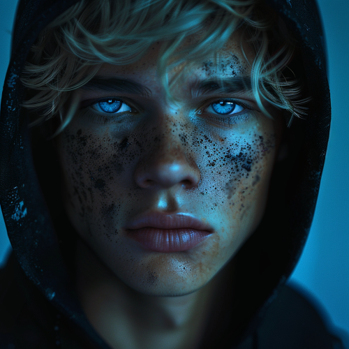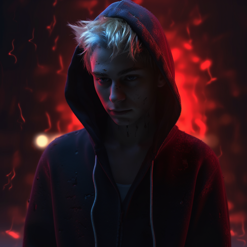 full body, young male, dirt in his face, blonde died hair, big blue eyes, innocent look, slanky, black hoodie, 8k, digital art, octance render, extreme detail, simple and minimalistic background, dark blue and red lights, cinematic lighting --v 4