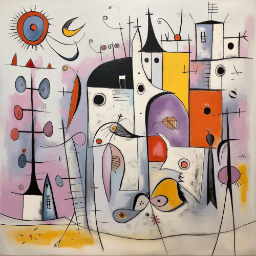 **a miro like composition with fantastic animals and buildings, ochre, soft violet, white and gray, knife large oil strokes --v 5.2