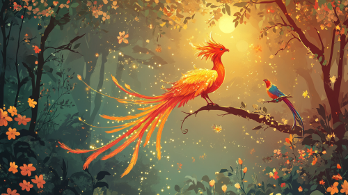 Flat illustration made by outline and painted in bright colors. Create a fairy-tale forest with flowers and trees along the forest there is a path on a branch in the foreground sits a large Firebird with a long fiery tail hero of Russian fairy tales in red-orange tones around her flying multicolored flowers magical glow light haze view in perspective additionally around flying birds of paradise that collect nectar in the sky red sun its rays illuminate the image of a fairy-tale fantasy world, high quality --ar 16:9