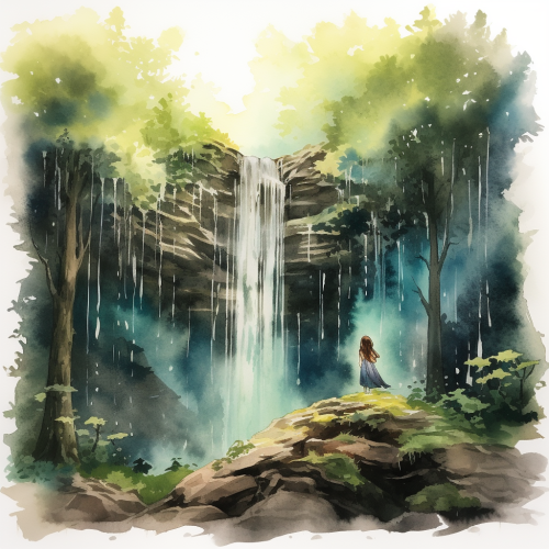 a forest fairy stands in front of a crooked waterfall in the forest, watercolor, Disney style