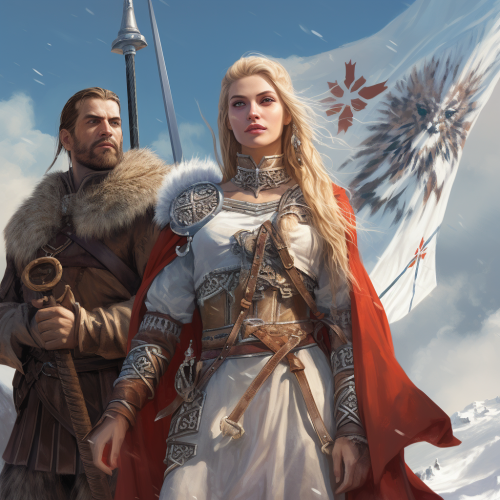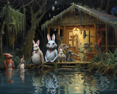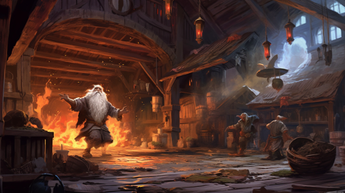 In a rustic, wooden hut, a scene of fantastical chaos unfolds. A giant, towering and muscular, is caught mid-stride, his massive feet narrowly missing a friar, a full elf, and a half-elf. The friar, robed and wide-eyed, clutches a holy symbol, while the full elf, agile and graceful, dodges with ease. In the corner, the half-elf lies injured, a look of pain etched on his face. The hut's interior is a blur of motion, with wooden furniture overturned and trinkets scattered. Photography, Canon EOS 5D Mark IV DSLR camera, EF 50mm f/1.8 STM lens, Resolution 30.4 megapixels, ISO sensitivity: 1600, Shutter speed 1/250 second, dynamic lighting casting deep shadows and highlighting the tension, a color palette of earthy browns and greens, a composition that captures the urgency and danger of the moment --ar 16:9 --v 5.1 --style raw --s 750.