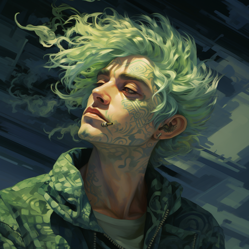 a illustration of a man smoking, with green hair, very detailed, beautiful colors - niji 5