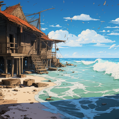 anime screengrab of a highly detailed sea beach of goa, sea foam, beach shack and bar,studio ghibli style, chaos-150, stylize-250
