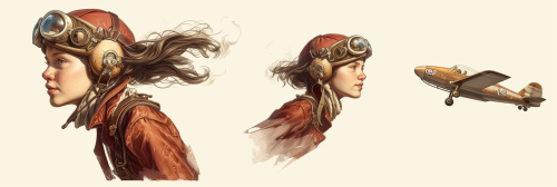 portrait book cover illustration by jean - baptiste monge of a flying rocketeer pilo,female , 360 turnaround, full character sheet --ar 3:1 --v 6.0