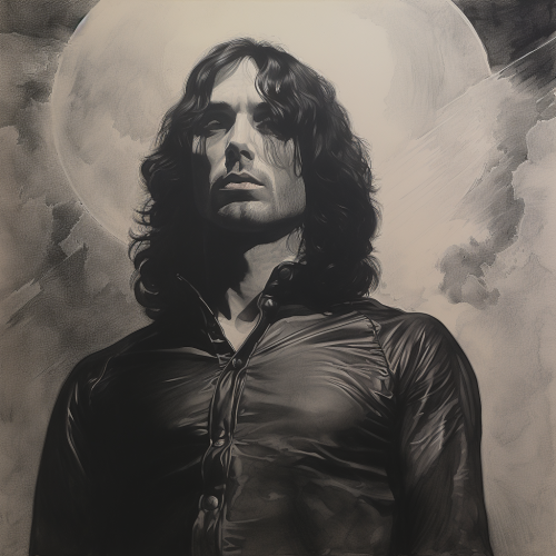 1970's dark fantasy book cover paper art, drawing of johnny silverhand with minimalist far perspective