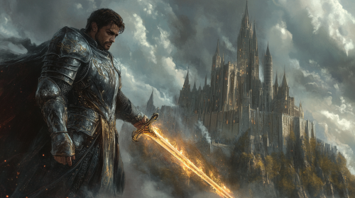 dark fantasy, master sorceror on top of a cliff, pondering and scheming holding firearms dark colors and atmosphere