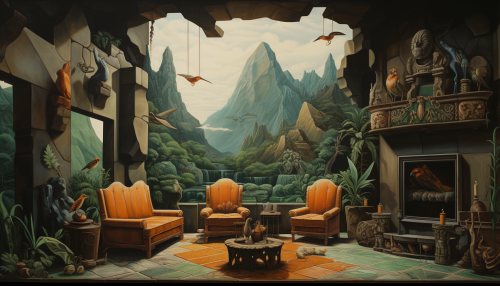 illustration of an office room in a fantasy castle with two couches that face each other infront of a fireplace and a map:: on the wall, realitic --c 10 --ar 7:4
