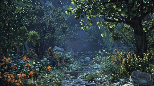 Concept Art, a fertile [orchard ]:: 3 with lots of trees full of [fruits]:: 2 , fantasy --s 750