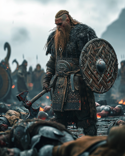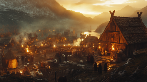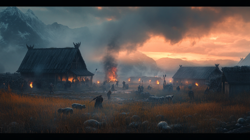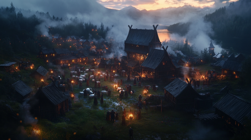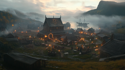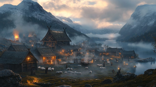 A still from fantasy D&D universe movie, a wooden fortified viking village defended by a viking military troop, lite on torches with soft misty smoke and fog, volumetric lighting, wives and children playing around with few sheeps in a farm, viking longships, Autumn Sunset over a fjord background --ar 16:9 --v 6.1