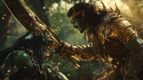 A still from fantasy D&D universe movie, photorealistic, Elven King in shiny armor fighting against an orcish champion, magical forest background, epic dynamic heroic action pose, epic cinematic composition, soft natural color grading --ar 16:9 --v 6.1