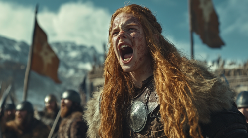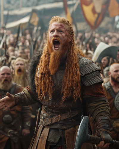 A still from fantasy D&D universe movie, a sixteen years old, 6.5 feet tall viking hunter with long red hairs talking with enthusiasm to a viking crowd, epic dynamic heroic action pose, epic cinematic composition --ar 4:5 --v 6.1