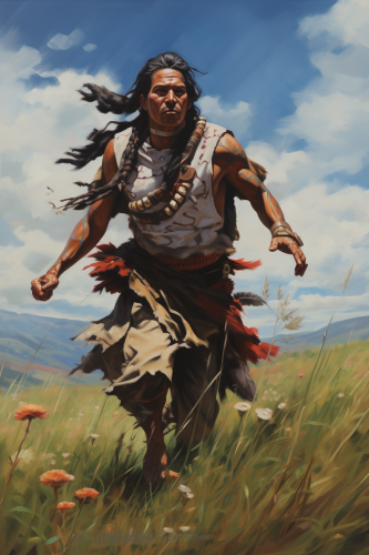 D&D production, full body oil painting of a ancient iroquois american warrior, movement, dynamic pose, epic meadow background, 4k, realistic, --ar 2:3 --v 5.2
