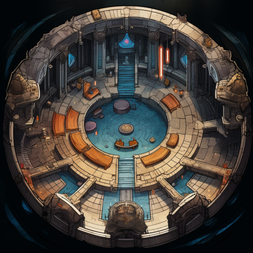Detailed Colour Digital Sketch, Dungeons and Dragons Map for use with miniatures, from a D&D adventure module, above view, featuring a circular arena floor + surrounded by concentric tiers of benches + in a cellar, hyper detailed, a large cone of crystal rises from the center of the arena floor, looks like the Crystal Chamber in the Dark Crystal movie --v 5.2 --ar 1:1