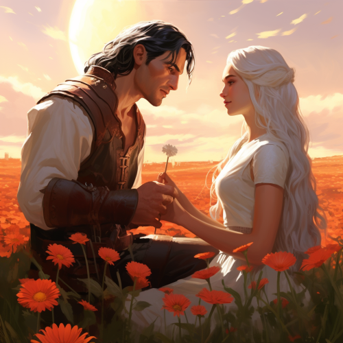 D&D Art Style, Portrait, a field of flowers, Human man with black hair, a female elf with white hair, the man giving a simple flower to the female, happy, in love, Sunshine