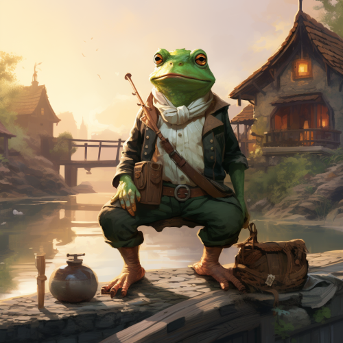 A high-resolution square image depicting an ordinary green Bullywug in a D&D setting, dressed as a normal villager and tenderly caring for a group of toads. The artwork should have vibrant colors, detailed textures, and a whimsical, fantasy aesthetic. Incorporate elements like lush vegetation, a quaint village backdrop, and soft lighting to enhance the scene's charm. Use a stylization value of 150, an aspect ratio of 1:1, and a chaos value of 5 to ensure varied and imaginative interpretations.
