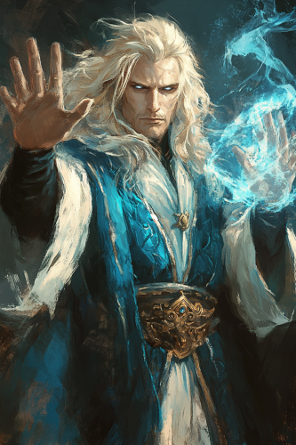 a sorceror in blue and white robes with blonde hair, holding up his hands which are creating a transparent blue cyan magical barrier in front of him, he is concentrating hard, his eyes have a soft magical glow, painted in a grim dark fantasy style, painted in rough guache --ar 2:3