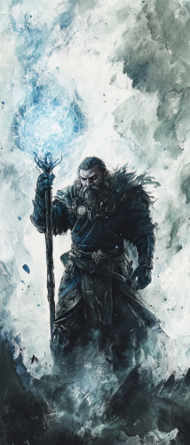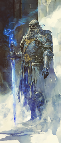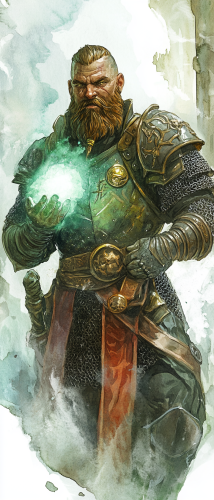 A dwarf paladin casting a spell. Dark fantasy setting. Watercolor art style. Mood is eerie and ethereal. Background is partial watercolor with some white space. --ar 3:7