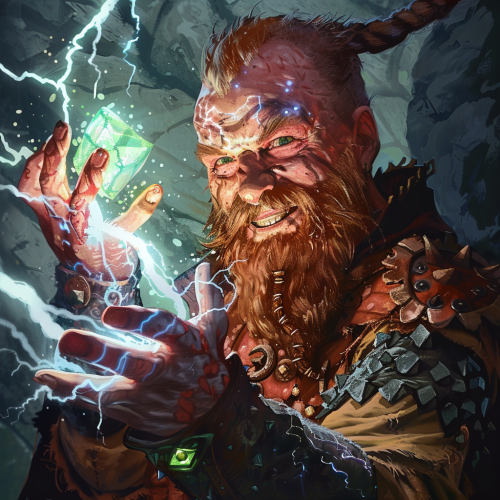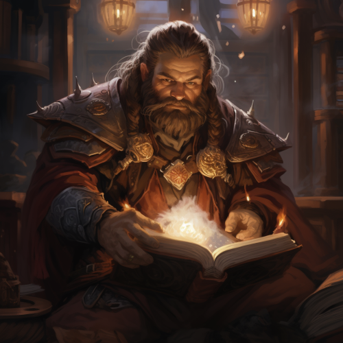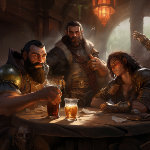 an human warrior, a dwarf cleric, a high elf sorcerer, an half-orc barbarian sitted in a tavern drinking