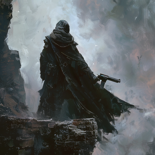 dark fantasy, master sorcerer on top of a cliff, holding modern pistol, close up, dark colors and atmosphere
