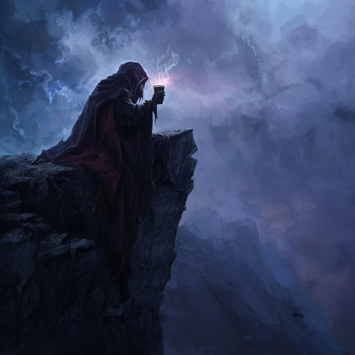 dark fantasy, master sorceror drinks from styrofoam cup on top of a cliff, dark colors and atmosphere