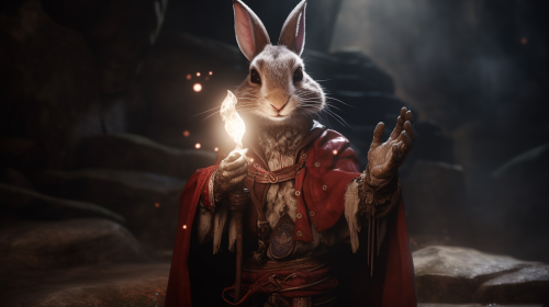 a hare-human sorcerer, female, using magic, dungeons & dragons, high fantasy setting, cinematic lighting, wide angle, 4k real --ar 16:9