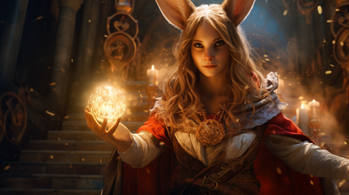 a female hare-human sorcerer using magic, dungeons & dragons, high fantasy setting, cinematic lighting, wide angle, 4k real --ar 16:9