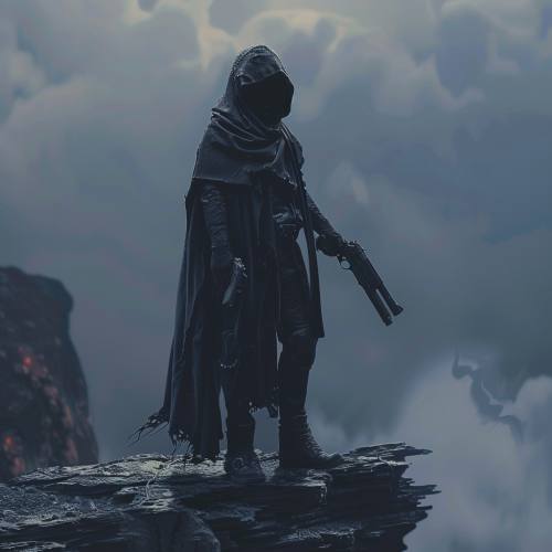 dark fantasy, master sorcerer on top of a cliff, holding glock firearm, close up, dark colors and atmosphere