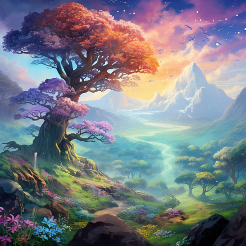 fantasy forest during the day, oak trees with large branches, magical flower field, distant mountains, pastel colors