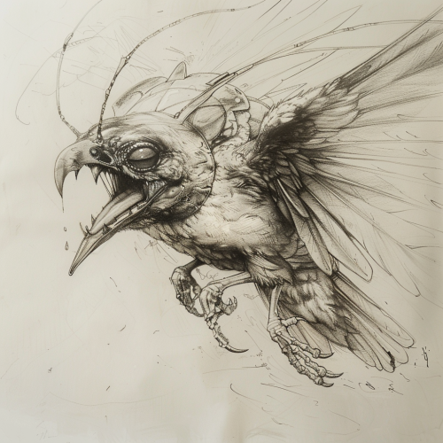 A creature with the eyes and mouth of Balaeniceps rex, a body covered with lizard skin, short wings that look like bat wings, about 150 cm tall, long legs, a long tail of a bird, and the body of a tyrannosaurus paw.